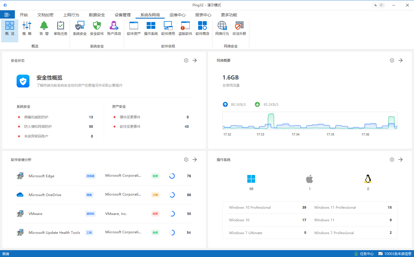 现代 IT 软件资产办理系统不再局限于根本台账记实,融合了资产清点、软件统计、平安加固取操做审计等功能。Ping32 可对终端软件进行持续监测和分类统计。